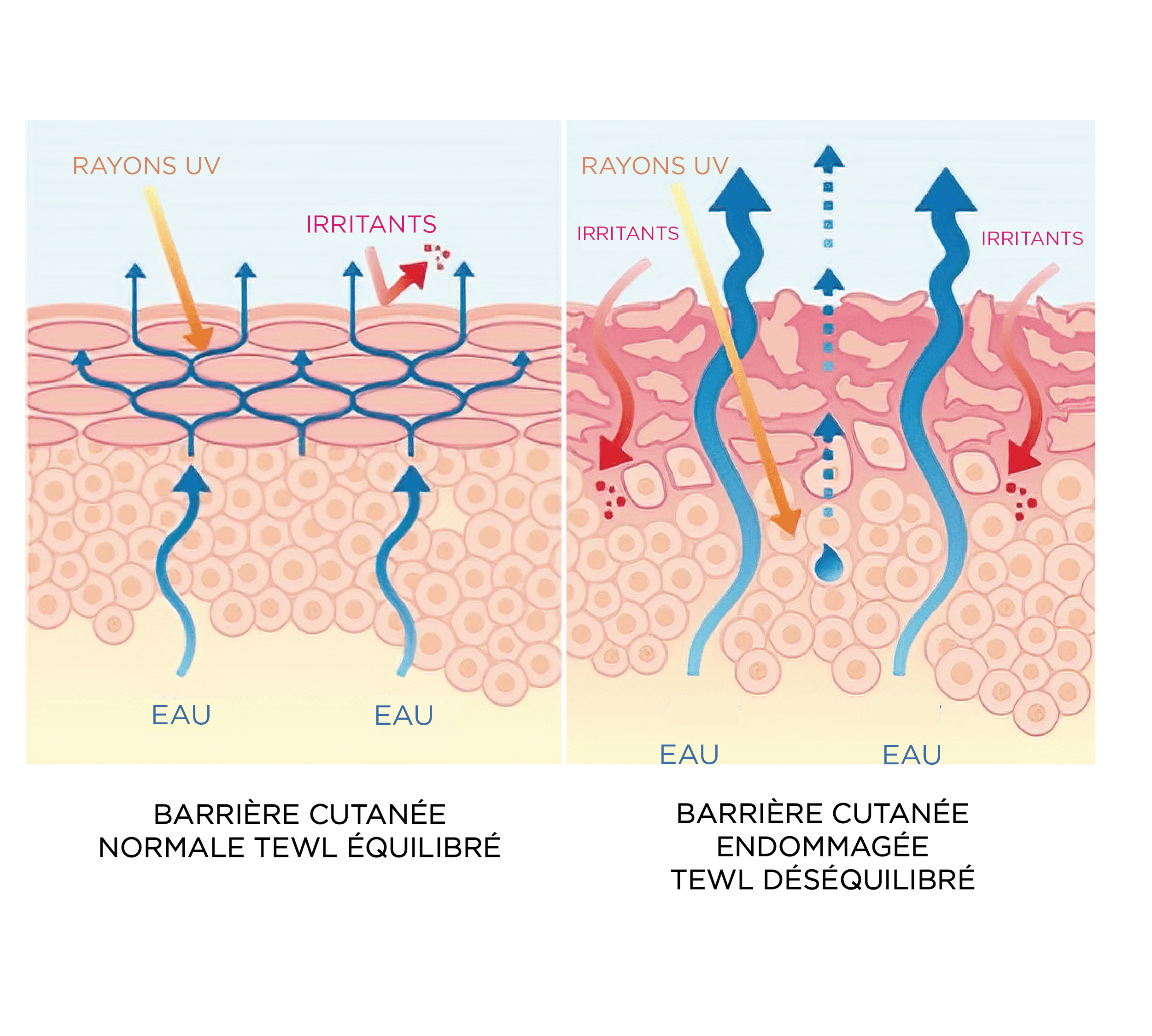 .La régulation de l'eau est l'équilibre entre l'eau statique et l'eau dynamique. Cet équilibre assure à la fois l'intégrité physique et les propriétés fonctionnelles de la peau.