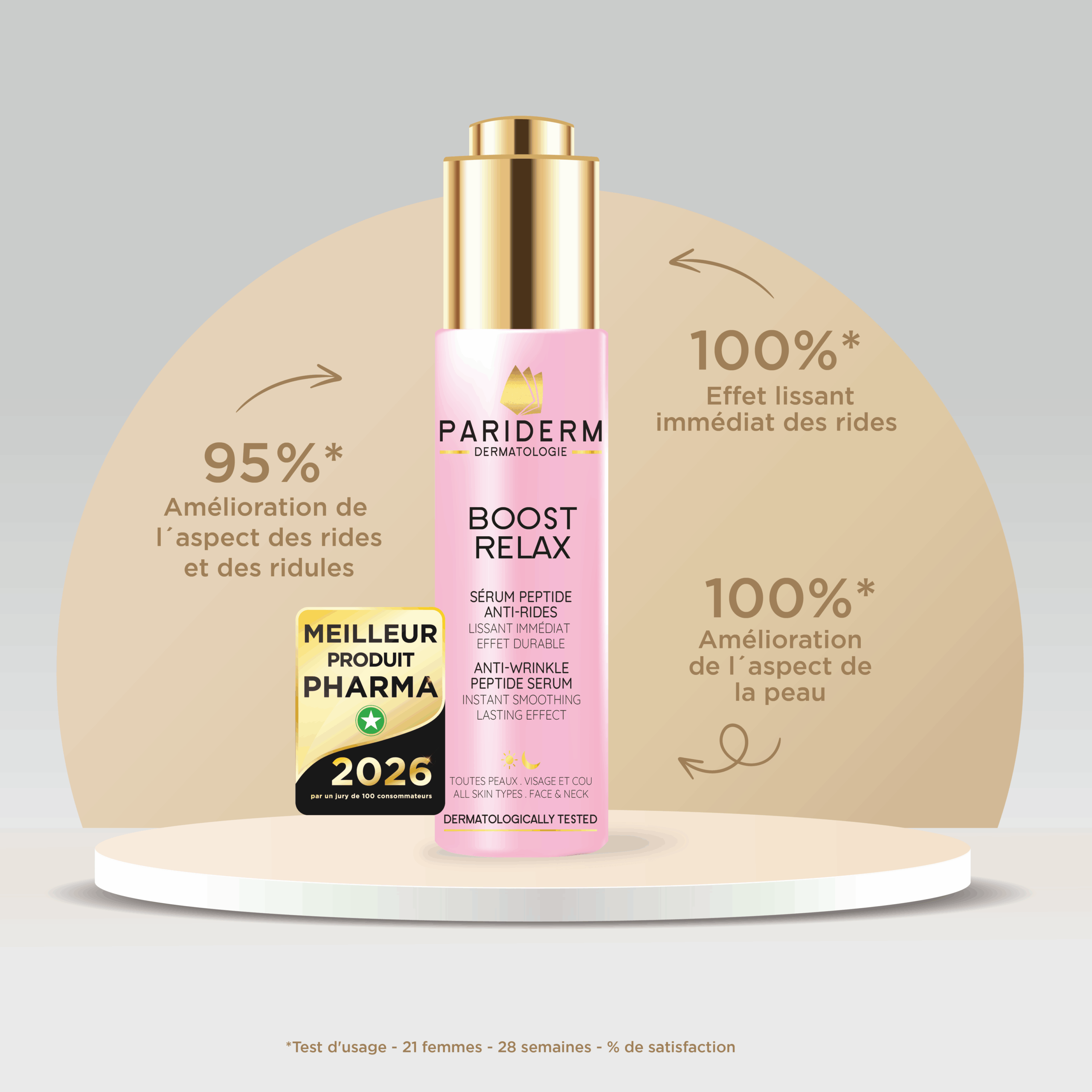 BOOST RELAX est un sérum peptide quotidien, relaxant immédiat des rides, notamment les rides d’expression. Il contient un tripeptide pour une action efficace, immédiate et durable sur les ridules au niveau du front, les pattes d’oie et les rides nasolabiales. Avec un effet anti-âge, il réduit l’apparence des rides, après un mois d’application seulement. Texture légère rapidement absorbée, non grasse et non collante.